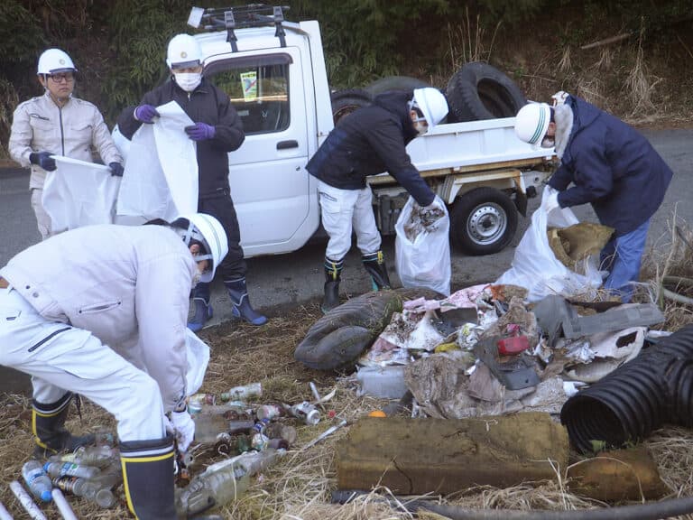 紀宝町高岡の町道相野口永田線で、不法投棄物の回収作業を行いました。近隣の山中や相野谷川沿いにごみが散乱していることから、地元高岡区、日本商運、日本環境土木、三重県熊野建設事務所、紀南地域活性化局環境室、紀宝町の協力により環境美化として実施。トラックや農機具のタイヤ、土木資材、電化製品の部品などが回収されました。また、周辺の草刈りも行ったほか、ごみの不法投棄に注意を呼びかける看板の設置も行いました。