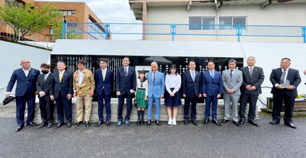 三重県尾鷲市中村町の市立中央公民館下の歩道に、「尾鷲節」の石碑を設置し、尾鷲市から感謝状をいただきました。市役所別館と中央公民館横の銀杏通りに面した壁面は、以前に塗装されてから30年が経過し汚れた状態であったことを市民らが危惧。尾鷲市が全国に誇る「尾鷲節」の歌詞が刻まれた幅6.3㍍、高さ1.4㍍の黒御影の歌碑を設置するに至りました。
