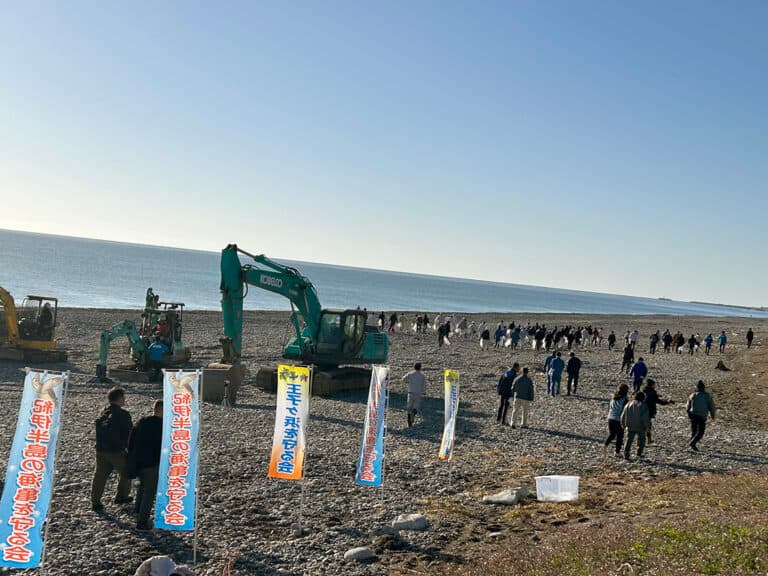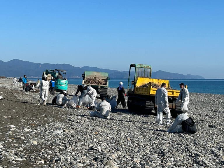 三重県の尾呂志川から井田川にかけての七里御浜六部海岸で清掃作業を実施しました。山地地区企業会、御浜町建設業組合、紀宝町、新宮市の建設業者、三重県職員、御浜町役場、林野庁などに協力・ご参加いただきました。総勢約250人で海岸の漂流ごみや流木などを撤去しました。