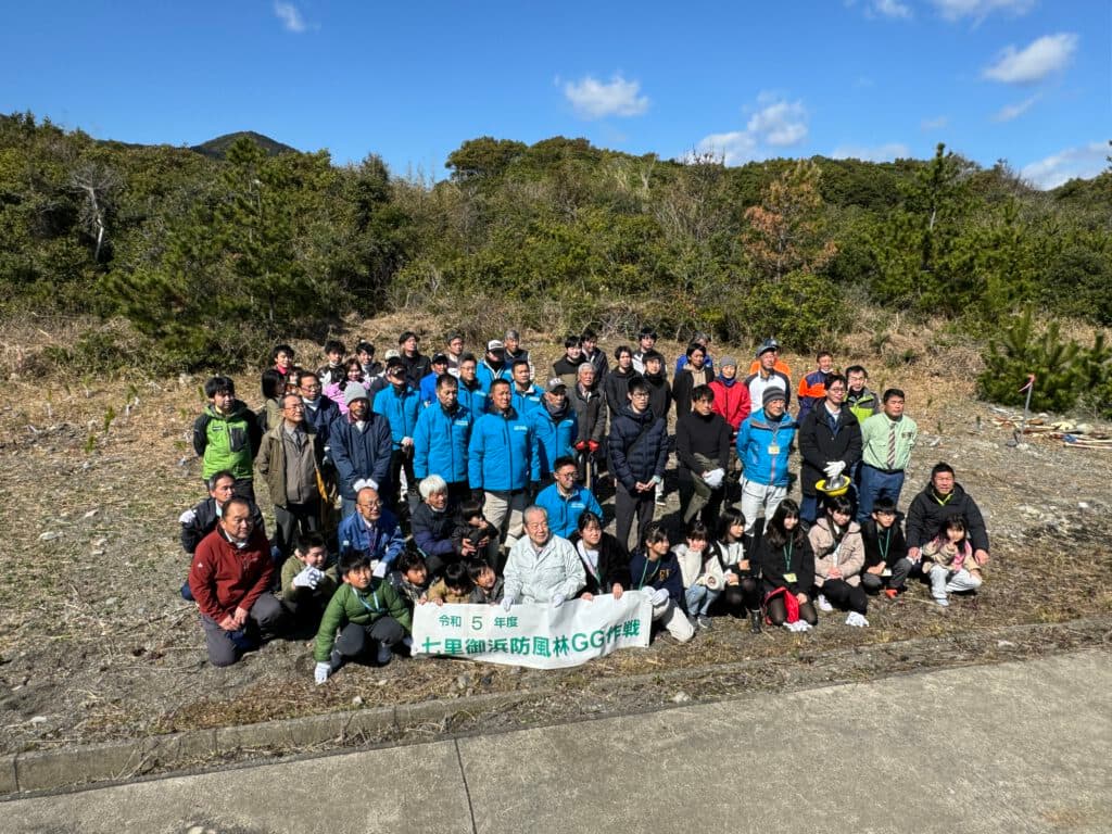七里御浜国有林内の3会場(熊野市・御浜町・紀宝町)で「令和5年度七里御浜防風林GG(グリーン・グロー)作戦」(熊野市・御浜町・紀宝町、熊野農林事務所、環境省近畿地方環境事務所、三重森林管理署で構成する「七里御浜松林を守る協議会」主催)を実施しました。今年で27回を数える取り組みで、今回は3会場で苗木240本を植栽。当連合会からも13人が応援に駆けつけ、防風林を守るために汗を流しました。