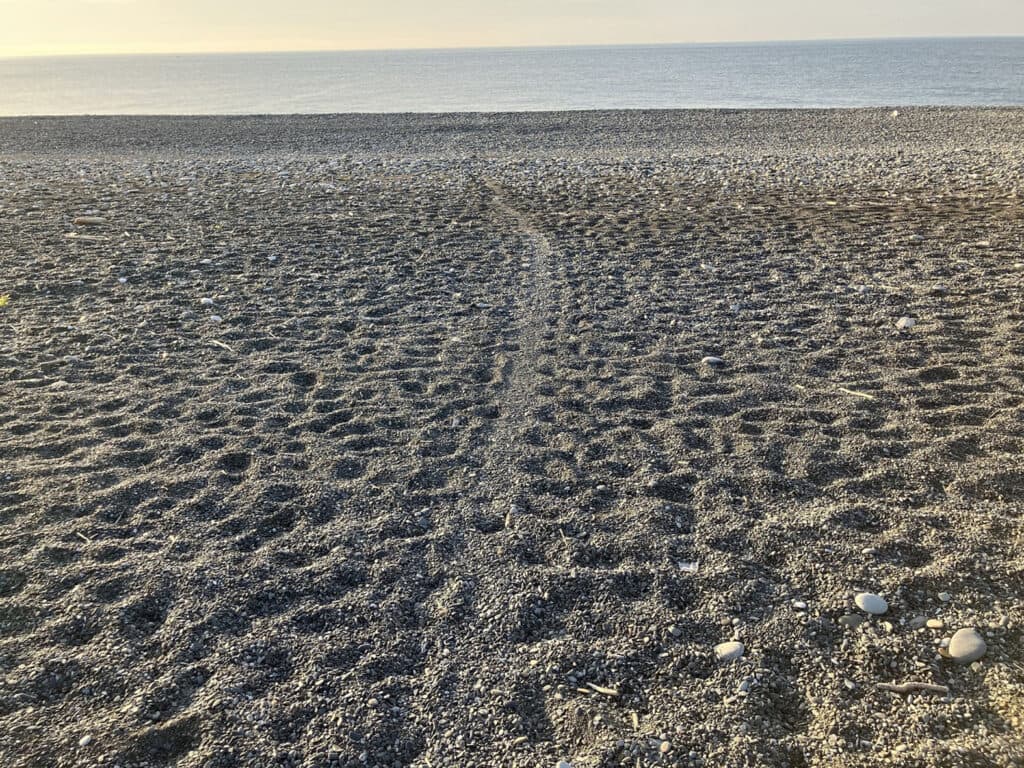 同日午前5時20分ごろ、海岸で早朝パトロールを行う「紀伊半島の海亀を守る会」のメンバーらがちびっこ広場近くの海岸でウミガメの足跡を発見!