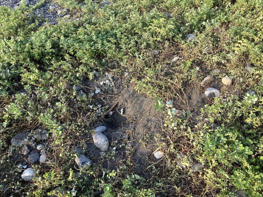 波打ち際から約50メートルの植生地帯と、そこから約10メートル南側の砂地地帯の2ヶ所に卵を産むための穴を掘りましたが、下の砂利層が硬く、産卵に必要な約70センチの深さが確保できず、諦めて海に帰っていったようです。せっかく上陸してくれたのに残念ですが、再上陸&産卵を願うばかりです。