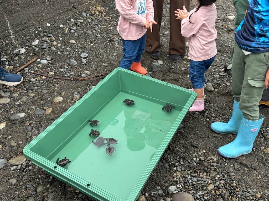 残念ながらこの日は天候が悪く、危険が伴う恐れがあるためウミガメの赤ちゃんの見学会のみを実施し後日、会員にて安全に放流を行いました。