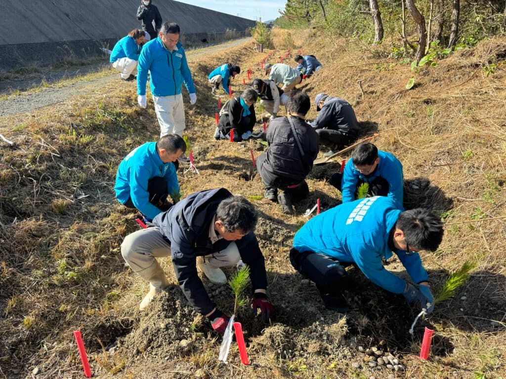 七里御浜国有林内の3会場(熊野市・御浜町・紀宝町)で「令和5年度七里御浜防風林GG(グリーン・グロー)作戦」(熊野市・御浜町・紀宝町、熊野農林事務所、環境省近畿地方環境事務所、三重森林管理署で構成する「七里御浜松林を守る協議会」主催)を実施しました。今年で27回を数える取り組みで、今回は3会場で苗木240本を植栽。当連合会からも13人が応援に駆けつけ、防風林を守るために汗を流しました。