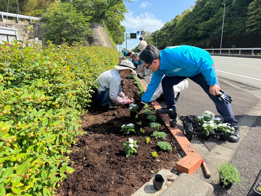 「環境美化は官民一体で」。新宮市の玄関口の一つ、高森の国道42号沿いの花壇で、「ボランティア・サポート・プログラム(VSP)」協定締結後、3回目となる花の植え替え作業を行いました。同協定は、国交省が地域の団体、自治体と締結し、ボランティアで道路の清掃や緑化などを通して環境美化を行うものです。那智勝浦町の花づくりボランティアで構成する「花てまりの会」の会員さんのご協力をいただき、今回はニチニチソウ、セダムを植えました。好天の下、メンバー、新宮市職員さんら10人が、気持ちの良い汗を流しました。