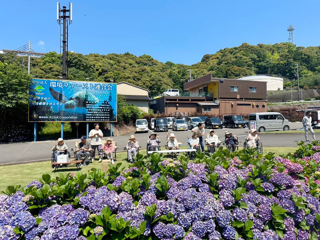 法人が管理する新宮市高森(通称)の国道42号沿いの花壇で、那智勝浦町二河の住宅型有料老人ホーム「Lino」の入所者さんをお招きし、アジサイの見学会を実施しました。