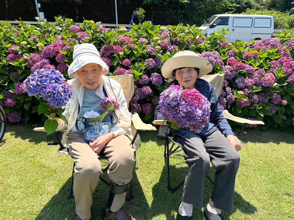 アジサイは6、7年前に植えたもので、今年は例年より少し早めの5月中旬からつぼみがつき始め、現在では紫色の艶やかな花を咲かせています。入所者さんたちは「キレイ」「かわいいね」などと口にしながら、目を細めていらっしゃいました。今後もこのような催しを積極的に開催していけたらと思います。ぜひ、お気軽にお問い合わせください。