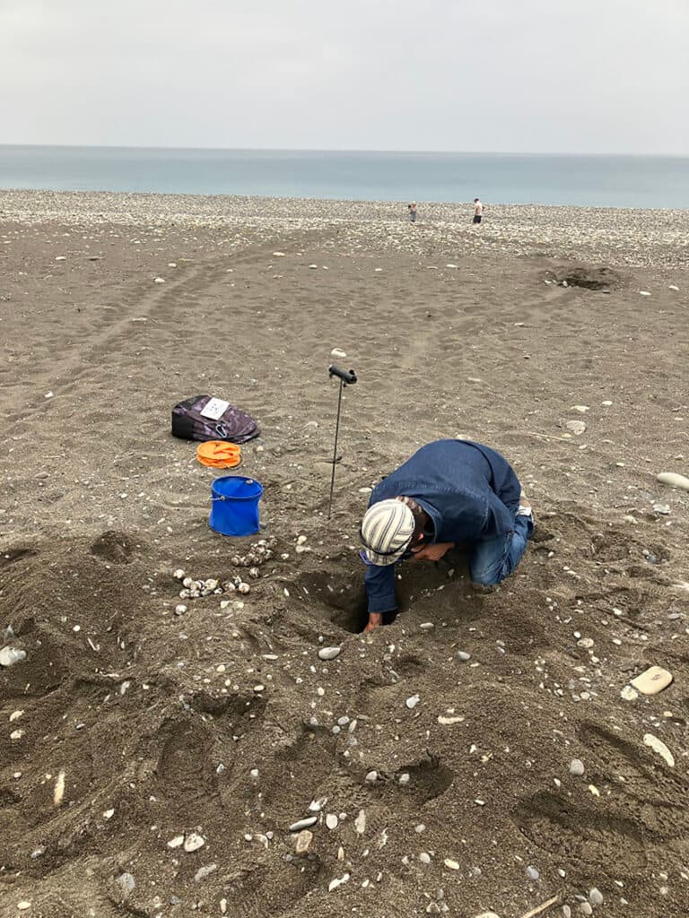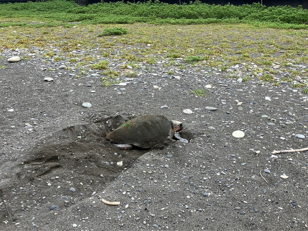 6月20日午前5時ごろ、早朝パトロール中のメンバーが、市立総合体育館近くの波打ち際から約80メートル付近の砂浜で、産卵を終えて砂で卵を埋めているウミガメの姿を発見!体長は約80センチで、足跡の大きさから19日に上陸したウミガメより大きい個体であることが想像できます。波打ち際から70メートルほどの場所にも穴を掘った形跡があったことから、砂利が硬かったため10メートルほど陸側へ移動して産卵したようです。